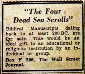The authenticity of the scrolls was still being debated by scholars. Some said they were a hoax. Samuel was declared an outlaw in the country of Jordan. A frustrated Samuel decides to sell the scrolls in America. He put a newspaper want-ad in the Wall Street Journal. On June 1, 1954, an ad was placed in the Wall Street Journal under the caption, “Miscellaneous for Sale.” The ad read: “The Four Dead Sea Scrolls Biblical Manuscripts dating back to at least 200 B.C. are for sale. This would be an ideal gift to an educational or religious institution by an individual or group.”